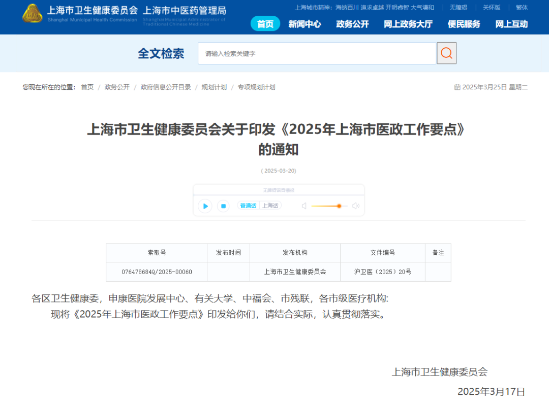 3月20日,上海市卫生健康委员会印发《2025年上海市医政工作要点》,明确了五大方面,21项重点工作。