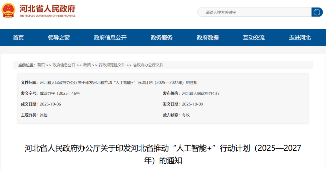10月9日,河北省人民政府办公厅印发《河北省推动“人工智能+”行动计划(2025—2027年)》,并于10月10日召开新闻发布会。