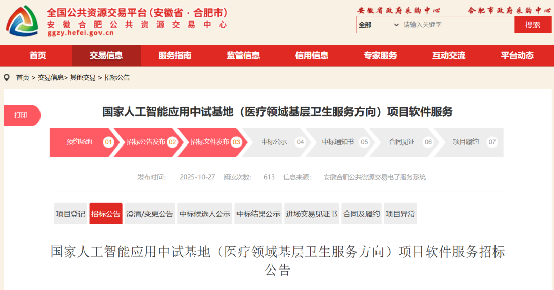 根据安徽合肥公共资源交易中心官网,此次启动招标的国家人工智能应用中试基地(医疗领域基层卫生服务方向)项目信息如下: