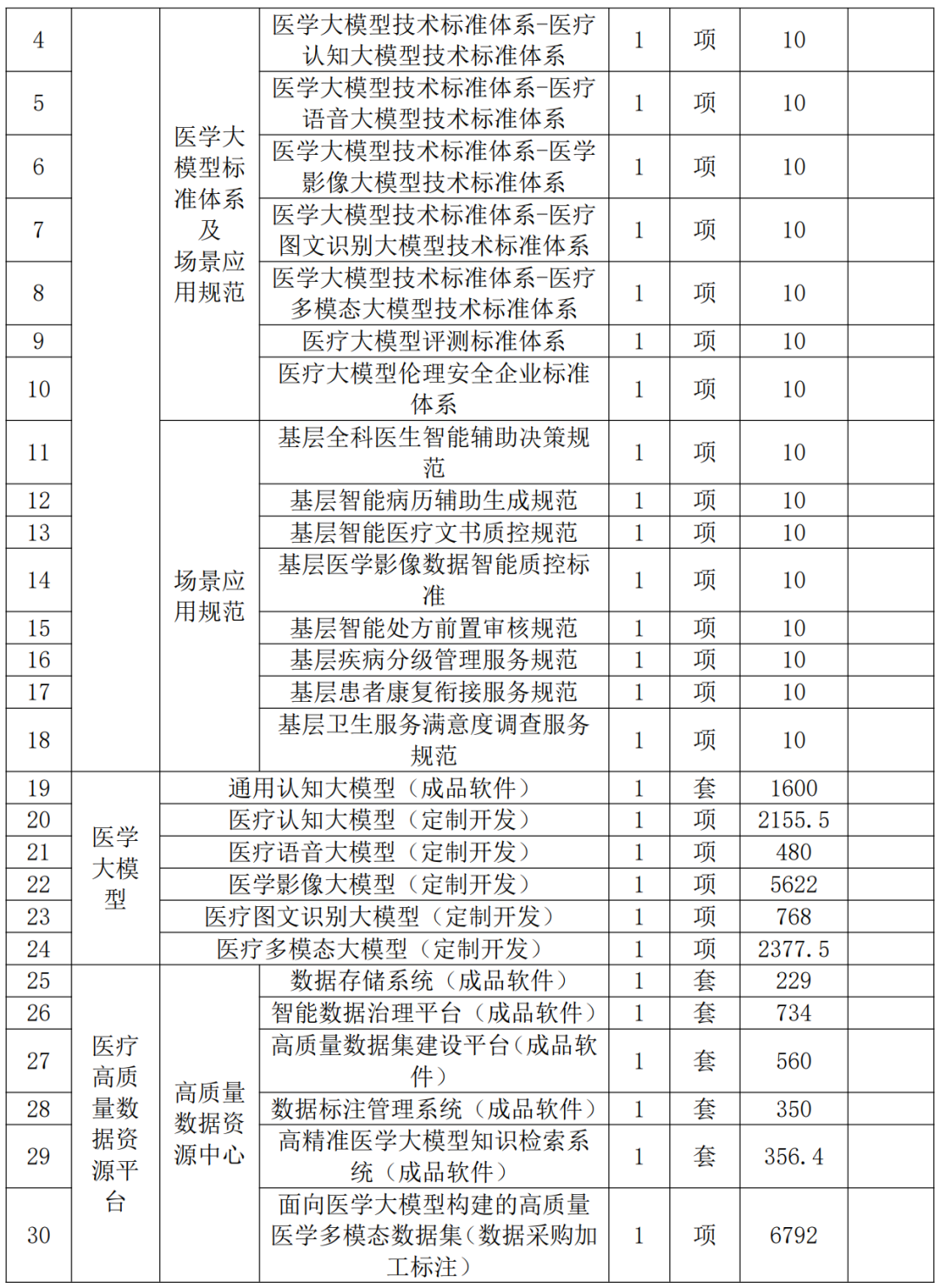 招标项目规模:围绕医疗中试基地共性支撑能力建设,采购通用大模型底座,并研发医疗认知、语音、影像、图文识别、多模态5个国产化自主可控的千亿级参数医学垂类大模型;建设医疗高质量数据资源平台,采集汇聚治理不少于5PB医疗健康行为数据,建设34个面向医学大模型增强的高质量医学知识库、42个面向医学大模型构建的高质量医学多模态数据集和11个面向基层医疗疾病研究转化数据集的医疗数据资源中心,打造居民的个人数字健康空间;打造医疗行业应用开发工具链,实现从数据管理、模型开发到智能体落地的端到端支撑工具链,推动大模型快速服务行业应用。