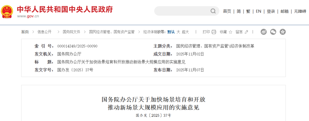 11月7日,《国务院办公厅关于加快场景培育和开放推动新场景大规模应用的实施意见》正式发布。