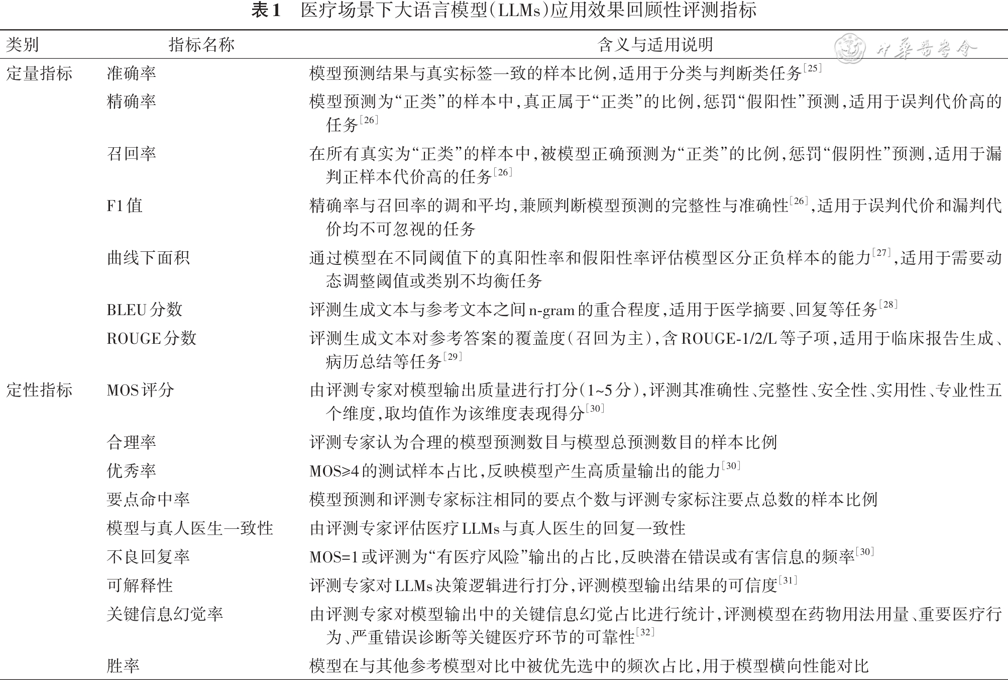 (二) 问题2:医疗场景下LLMs应用效果回顾性评测的指标有哪些?