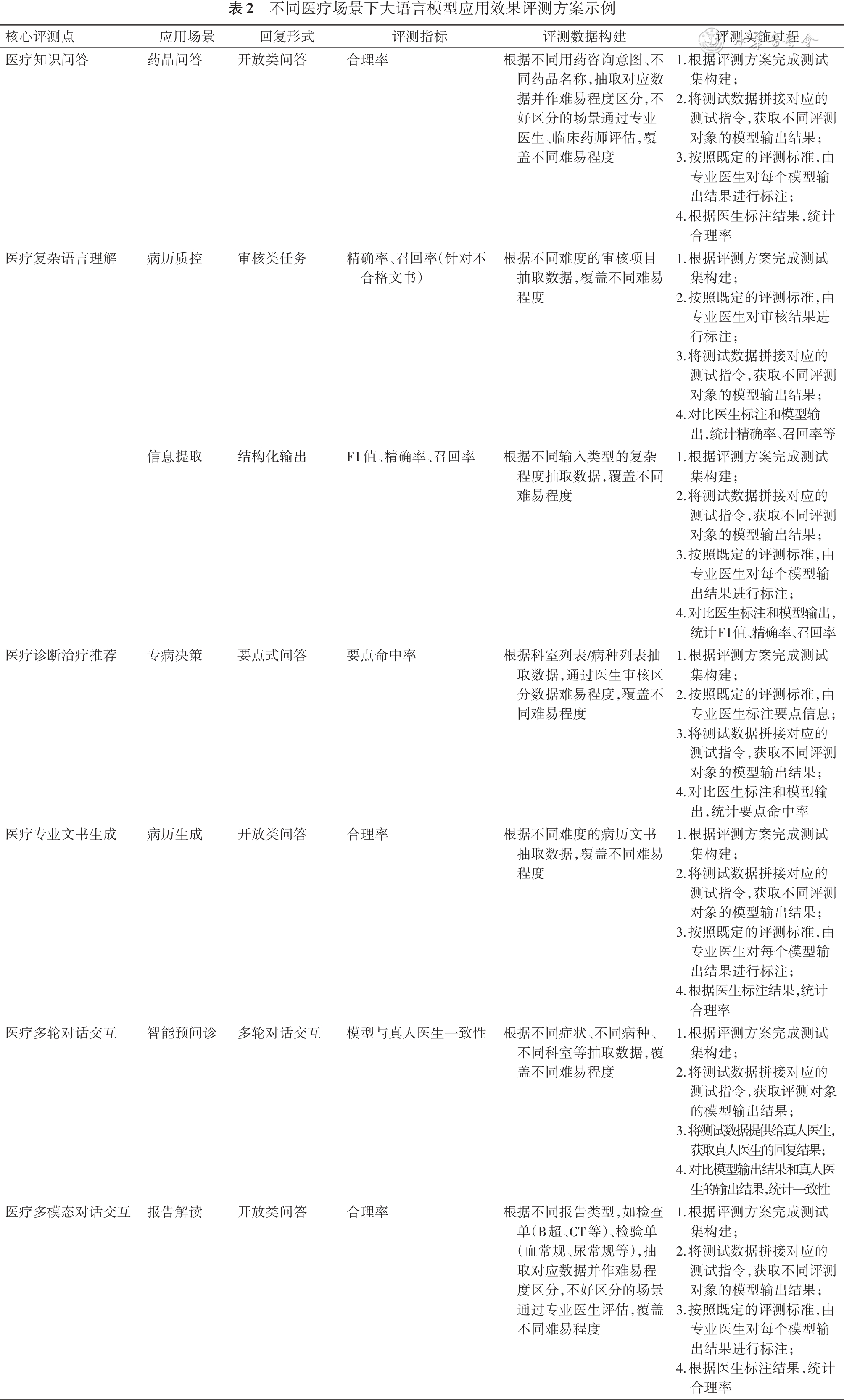 具体到不同应用场景中,从核心评测点对应的评测指标设定,到评测实施的全流程细节,在表2中提供了详细的示例,可作为实操参考。