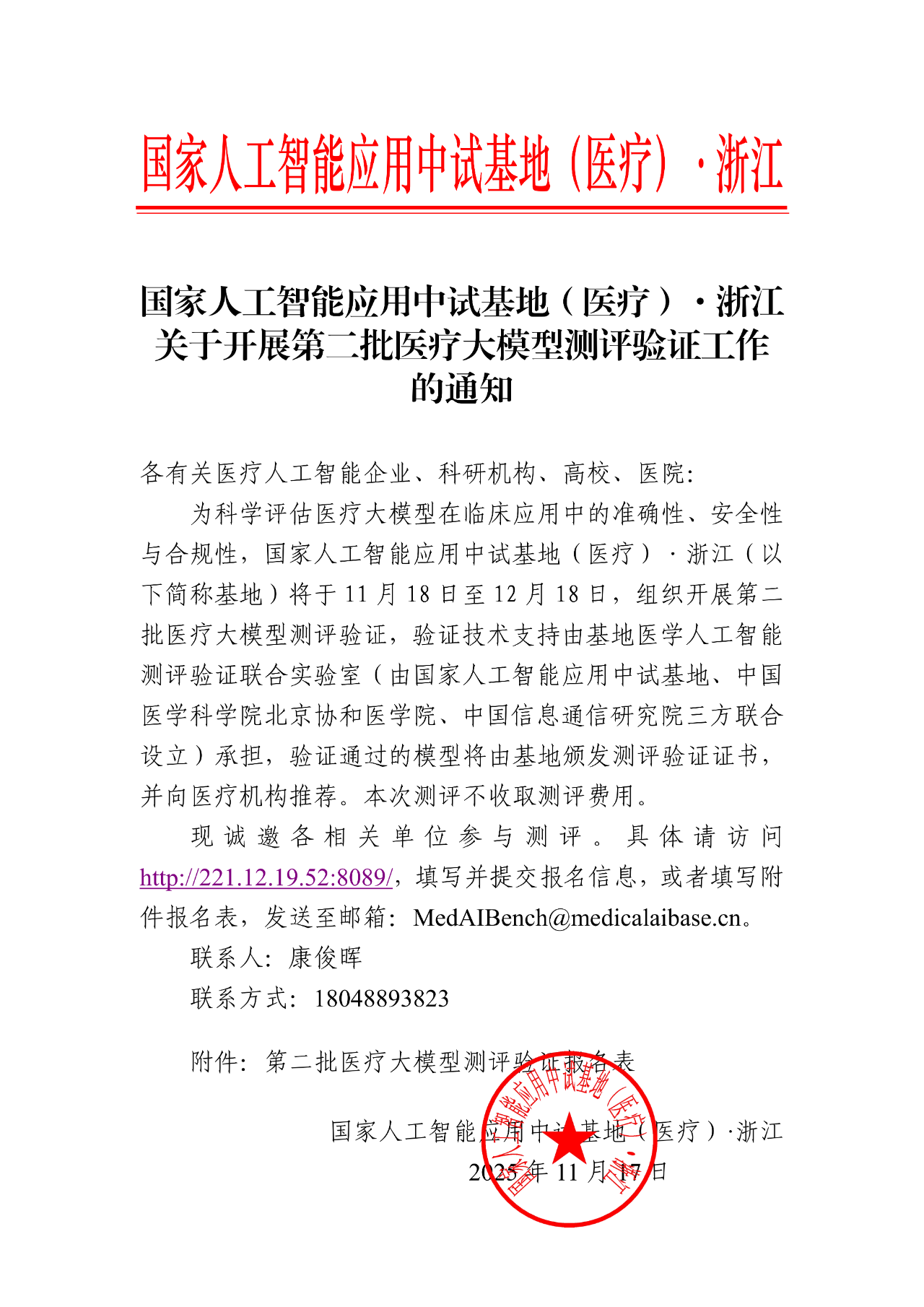 11月17日,国家人工智能应用中试基地(医疗)·浙江发布通知,将于11月18日至12月18日,组织开展第二批医疗大模型测评验证。