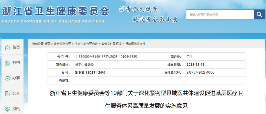 12月17日,浙江省卫生健康委员会等10部门印发《关于深化紧密型县域医共体建设促进基层医疗卫生服务体系高质量发展的实施意见》。