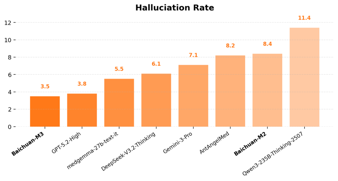 同时,百川M3实现了医疗幻觉率3.5,达到全球最低水平,首次在医疗领域全面超越 GPT-5.2 。