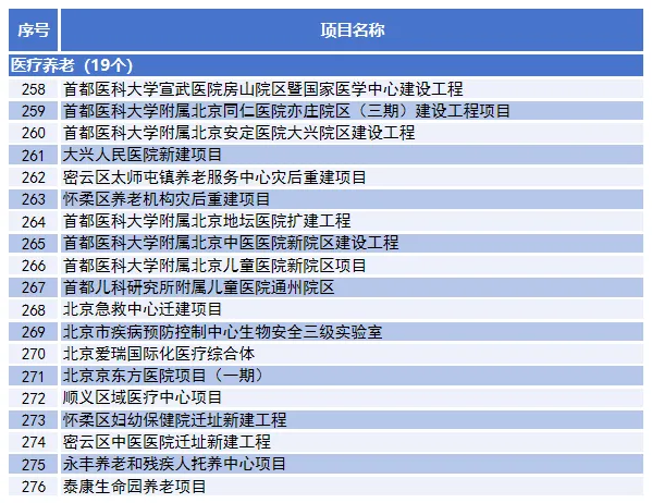 此外,2月2日,北京市发展和改革委员会还发布了《2026年北京市重点工程项目清单》,将集中推进100个重大科技创新及现代化产业项目、100个重大基础设施项目和100个重大民生改善项目。100个重大民生改善项目,当年计划投资1027亿元。其中将优化医疗养老托育服务供给,完善医疗卫生服务体系,安排医疗养老项目19个,具体如下:
