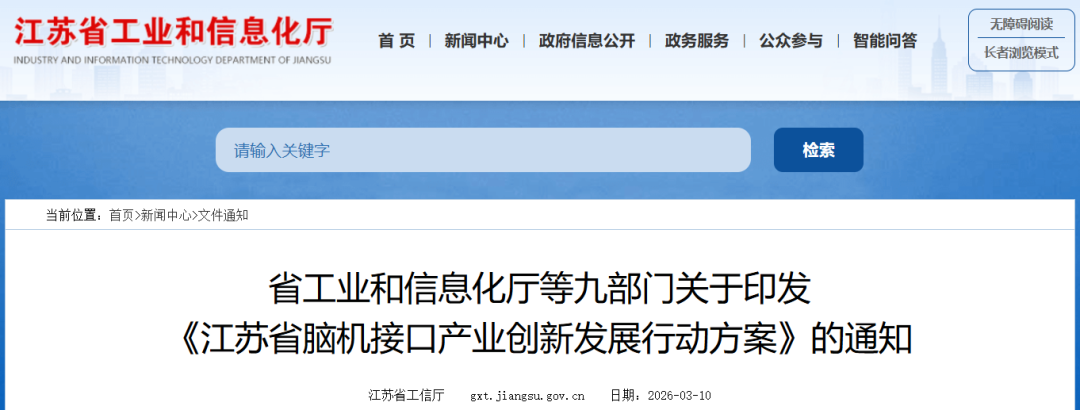 3月10日,江苏省工业和信息化厅、江苏省发展和改革委员会、江苏省卫生健康委员会等九部门印发《江苏省脑机接口产业创新发展行动方案》。