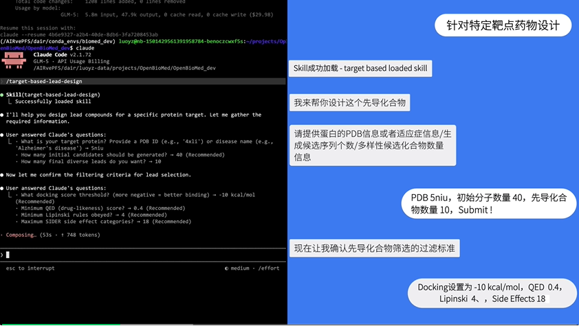 在“针对 PD-L1靶点设计先导化合物”的案例中,研究人员通过安装OpenBioMed Skills,即可借助Claude Code完成针对靶点的先导化合物设计,Agent与用户进行多轮对话,确认用户的参数设计,执行任务。并在结果输出后进一步给出优化建议。