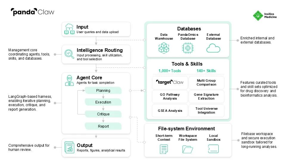 如果说 OpenBioMed Skills 解决的是“能力标准化”,那么英矽智能推出的 PandaClaw,则展示了一个将能力组织起来完成科研任务的“AI科学家”雏形。