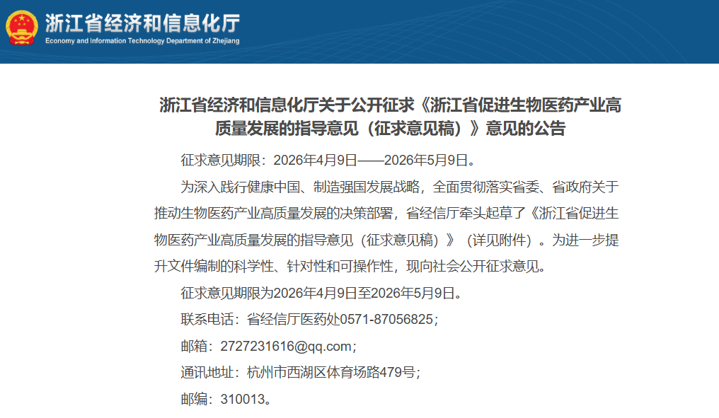 4月9日,浙江省经济和信息化厅发布公告,对《浙江省促进生物医药产业高质量发展的指导意见(征求意见稿)》公开征求意见。征求意见期限为2026年4月9日至2026年5月9日。