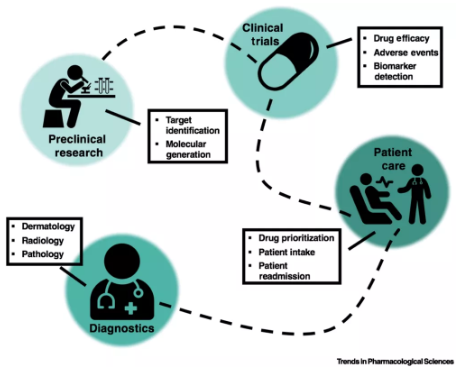 受AI影响的医学的另一个主要领域是早期/临床前药物开发,该领域受高失败率困扰,其中超过98%的所有临床前资产在投放市场之前就失败了。随着高通量筛选和基因组技术的出现,研究人员变得更容易获得可以输入到AI框架中的大规模,受控实验数据集。最近,我们的小组和其他研究人员表明AI可以利用庞大而多样的数据集来解决药物开发的多个阶段,例如识别新的靶标或药物候选物,将现有化合物定位为新的适应症或根据预测的不良事件使候选化合物脱险(图1)。