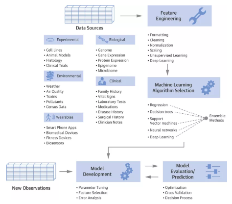 AI驱动的诊断背后的主要驱动力之一是可用于训练算法的大量图像。电子健康记录(EHR)是大数据的另一个来源,为基于AI的分析提供了巨大的潜力。EHR提供了一个独特的机会来利用广泛的时间序列患者数据,其中包括有关诊断、治疗、复发和合并症的信息。毫不奇怪,人工智能研究人员已经利用这些数据使用线性模型和神经网络创建了预测模型,用于各种患者护理问题,例如患者再次入院或发生特定医疗事件的风险。