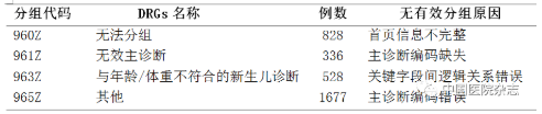 2.2.1 分组结果。经过对比,为使结果在上海市级医院层面具备可比性,采用上海市级医院基于危重度的疾病诊断分组规则及分组器为工具,进行DRGs分组。分组结果:2018年度样本医院全部112305例住院病例中,仅有3369例住院病例无法入组,未入组的病例见表2。