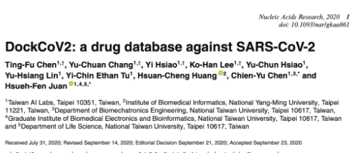 近期来自台湾大学研究团队针对加快新冠的潜在药物的研究开发了SARS-CoV-2的药物数据库DockCoV2,以预测台湾地区食品药品监督管理局和台湾地区国民健康保险批准的3109种清单药物与新冠病毒有关的5种蛋白质(刺突蛋白、3C样蛋白酶(3CLpro)、RNA依赖性RNA聚合酶(RdRp)、木瓜蛋白酶(PLpro)、核衣壳(N )蛋白和2种宿主蛋白血管紧张素转换酶II(ACE2)和跨膜丝氨酸蛋白酶II(TMPRSS2))的结合亲和力。该研究结果发表在《核酸研究》(Nucleic Acids Research)杂志上。