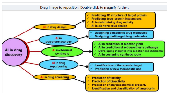 AI不仅在“老药新用”中呈现出色表现,在药物研发的其他领域也显露出积极作用。印度国家药品教育与研究团队发表在《今日药物发现》(Drug Discovery Today)杂志的一篇名为“Artificial intelligence in drug discovery and development”的综述指出,AI在制药行业各个领域如药物开发、提高药物生产率和临床试验的有效使用,减少了人类的工作量并在短时间内实现了目标。