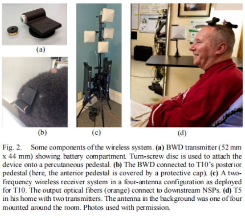 除此之外,传统的脑机接口外部电缆被一个最大尺寸约为 2 英寸、重量略高于 1.5 盎司的小型发射器所取代,也就是上文提到的布朗无线设备(BWD)。该设备可数字化每个电极上的神经活动,并用曼彻斯特编码(Manchester encoding)通过定制的低功耗协议将其传输到附近的天线。BWD 使用不可充电的医用级电池 (SAFT LS14250) ,且已经通过了临床前设备安全性评估。该装置位于使用者的头顶,使用与有线系统相同的端口连接到大脑运动皮质内的电极阵列。