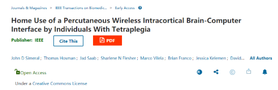 3 月 30 日,相关研究以“Home Use of a Percutaneous Wireless Intracortical Brain-Computer Interface by Individuals With Tetraplegia”为题发表在了 IEEE 生物医学工程学报(IEEE Transactions on Biomedical Engineering)上。