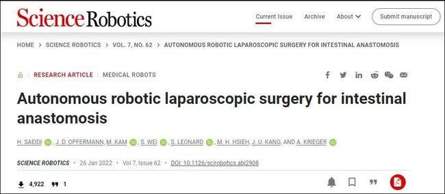 1月27日,美国《科学机器人》杂志发表了一篇研究文章,详细介绍了智能组织自主机器人(STAR)在没有人类指导的情况下对猪...