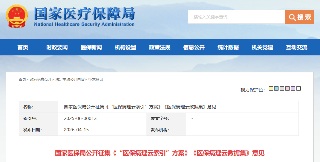 国家医保局公开征集《“医保病理云索引”方案》《医保病理云数据集》意见