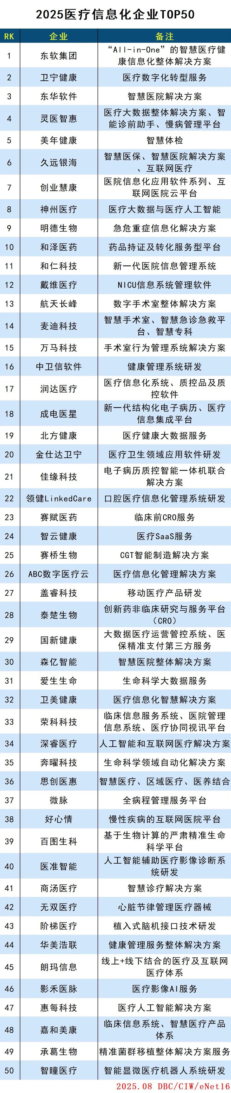 近日,德本咨询发布《2025医疗信息化企业TOP50》。