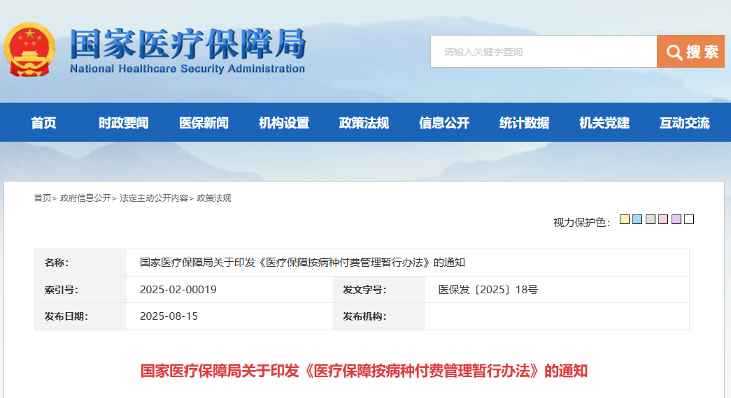 2025年8月15日,国家医保局正式发布《医疗保障按病种付费管理暂行办法》,自下发之日起施行。