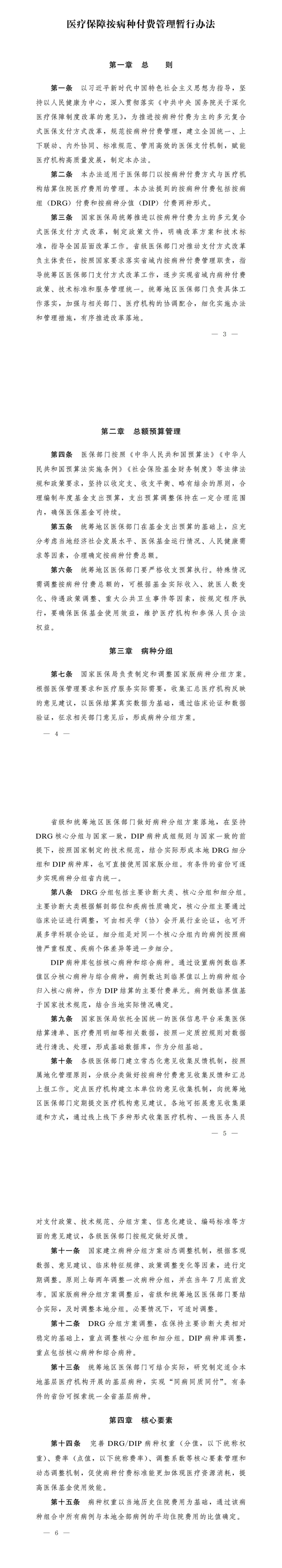 《办法》的基本架构共八章三十九条,对按病种付费有关政策、关键技术、核心要素、配套措施等进行了明确,突出了三个方面的规范:一是规范总额预算管理,要求合理编制支出预算,在此基础上确定按病种付费总额,强调总额预算的刚性。二是规范分组方案制定和调整。明确分组方案的制定主体、分组框架、数据和意见支撑、调整内容等,原则上要求分组方案两年调整一次。三是规范核心要素和配套措施。厘清了权重、费率、支付标准等内涵,要求核心要素确定中医保部门要与医疗机构充分协商,达成一致。规范医保支付相关的配套措施,包括特例单议、预付金、意见收集、谈判协商和医保数据发布等,提高医保支付的科学水平。