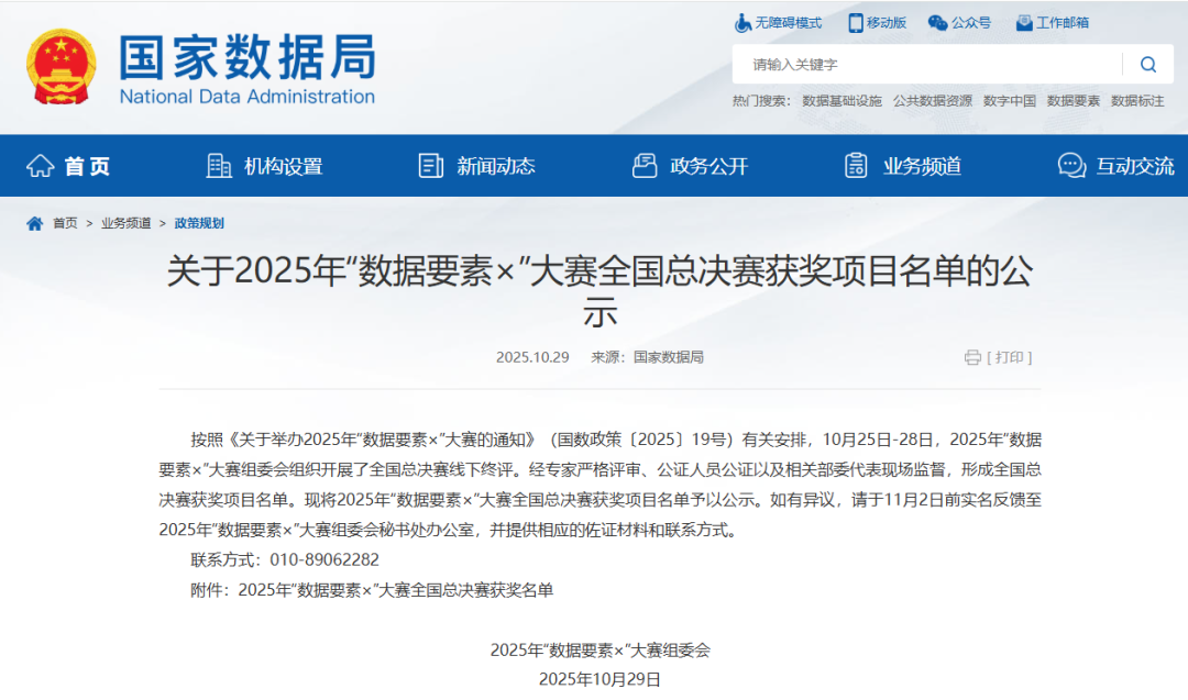 10月29日,国家数据局对《2025年“数据要素×”大赛全国总决赛获奖名单》进行公示。