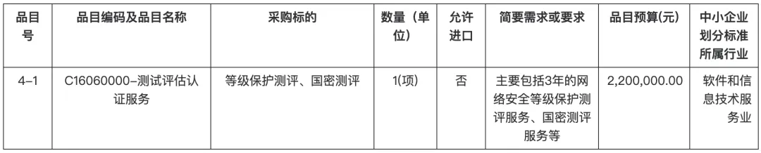 包 4、(等级保护测评、国密测评):预算 2200000 元。