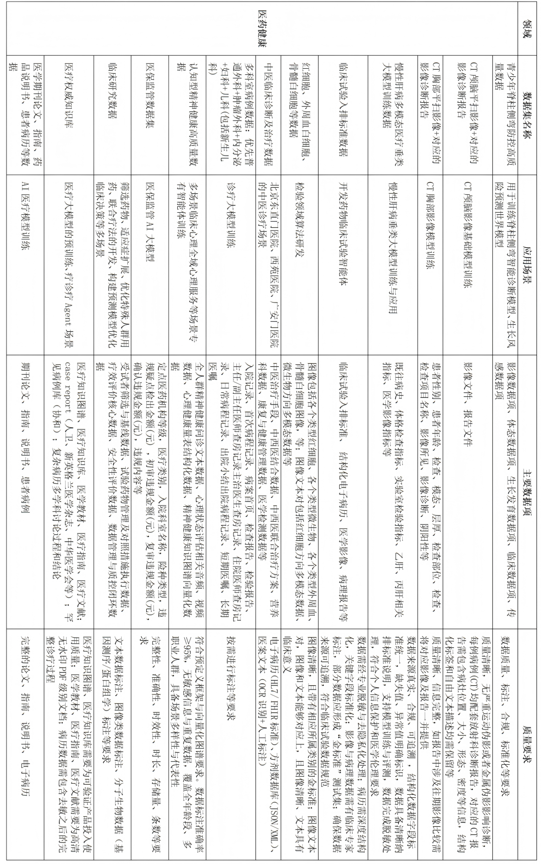 80个高质量数据集需求涉及世界模型和具身智能、智能制造、新一代信息技术、医药健康、智能网联、空天技术、能源材料、AIGC(视听)等领域。其中,医药健康领域共13项需求: