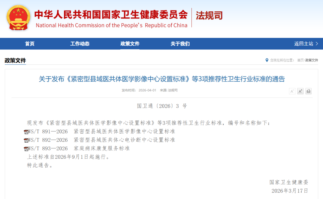 4月1日,国家卫健委发布《紧密型县域医共体医学影像中心设置标准》等3项推荐性卫生行业标准,自2026年9月1日起施行。