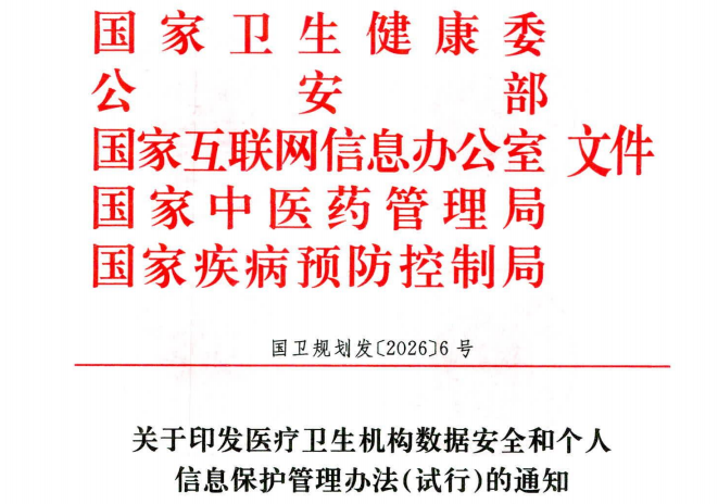 在此背景下,2026年2月14日,国家卫生健康委会同公安部、国家网信办等部门联合印发《医疗卫生机构数据安全和个人信息保护管理办法(试行)》(国卫规划发〔2026〕6号),自印发之日起施行。这标志着我国医疗卫生行业数据安全和个人信息保护进入制度化、规范化、标准化新阶段,也是继《网络安全法》《数据安全法》《个人信息保护法》之后,医疗卫生行业在数据安全领域的又一重磅政策。