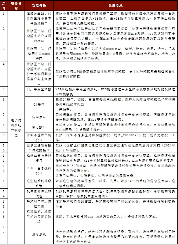 (1)五级建设:主体建设可分为三期,分三年规划:一期,以临床数据中心为主,临床知识库、药品闭环为辅;二期,充分建设临床管理、高阶临床及辅助管理系统(如手麻、重症、血透、康复);三期,信息化特色建设:患者服务(如微信支付)、BI、运营管理等。