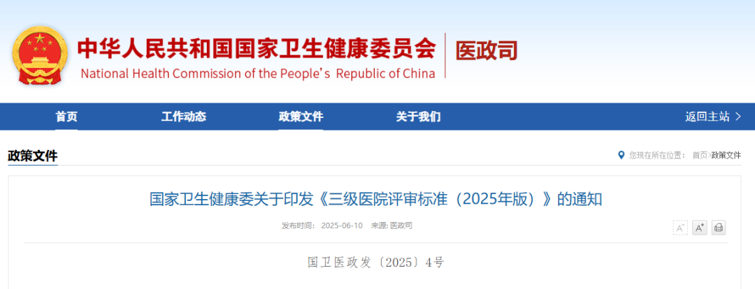 6月10日,国家卫健委正式印发《三级医院评审标准(2025年版)》。