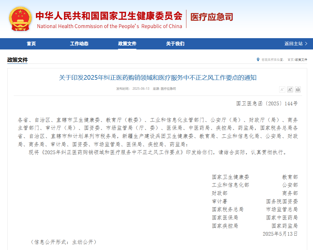 2025年6月13日,国家卫生健康委、工业和信息化部、国家医保局、国家药监局等14部委联合印发了《2025年纠正医药购销领域和医疗服务中不正之风工作要点》。