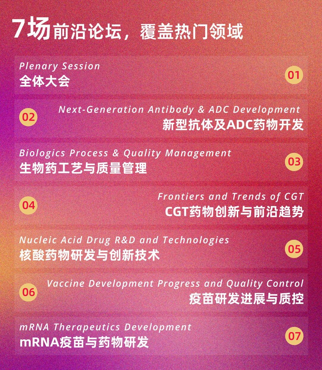 论坛将设置7大核心议程,全面覆盖细胞治疗、基因治疗、抗体药物、疫苗、mRNA疗法的研发、CMC工艺和质控等关键环节,嘉宾们将通过主题演讲、圆桌讨论与案例解析等多元形式,深入探讨从研发前沿到临床落地、从技术突破到产业升级的全过程创新生态,助力医药产业高质量发展。