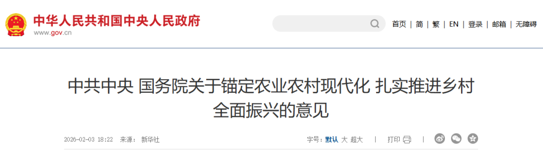 2月3日,2026年中央一号文件由新华社受权发布,对锚定农业农村现代化、扎实推进乡村全面振兴进行了部署。