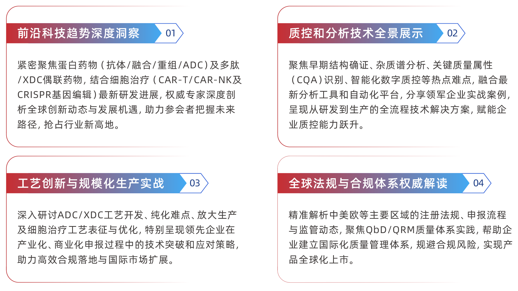 大会深入解析全球注册法规及多中心申报策略,推广基于风险的QbD/QRM质量管理体系实践,助力企业实现高效合规与国际化发展。通过多维度技术分享和实操经验交流,推动产业技术升级与质量体系完善,助力生物药行业迎接未来挑战,实现持续创新与高质量发展。