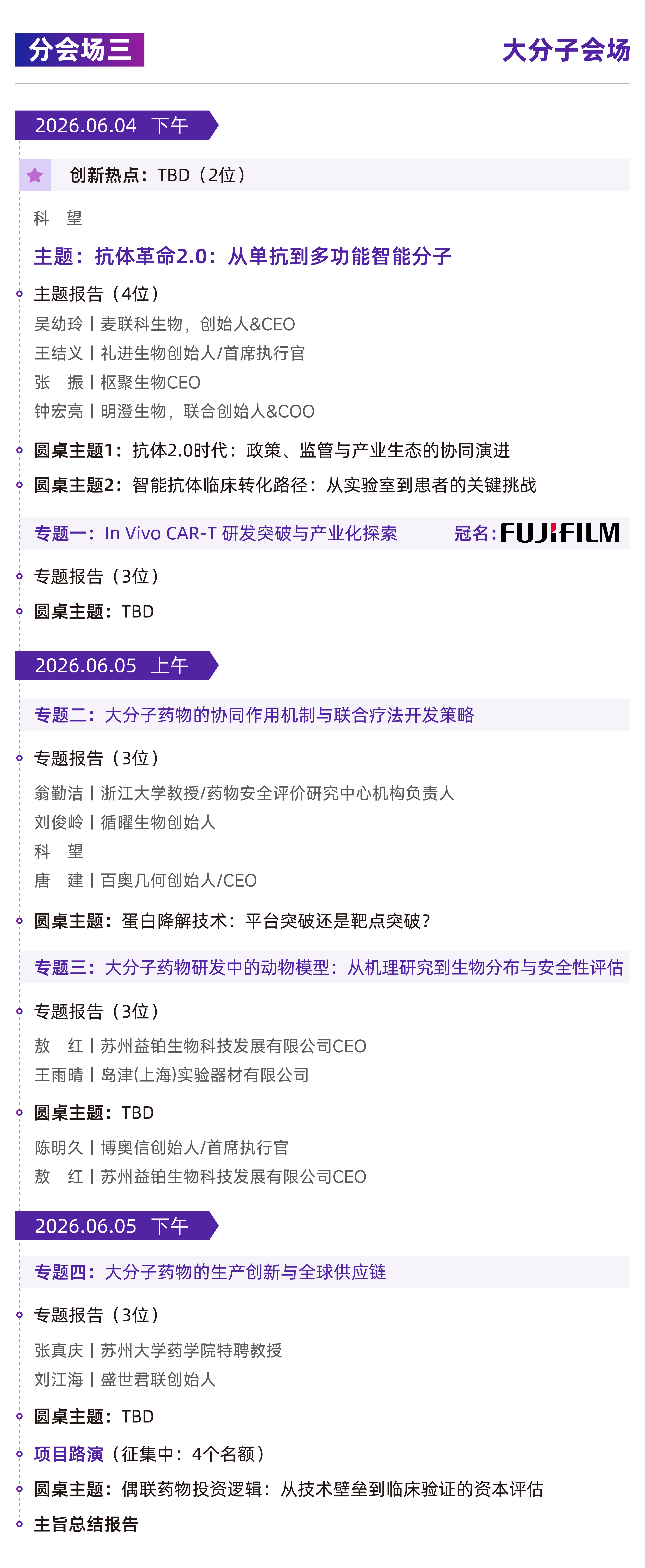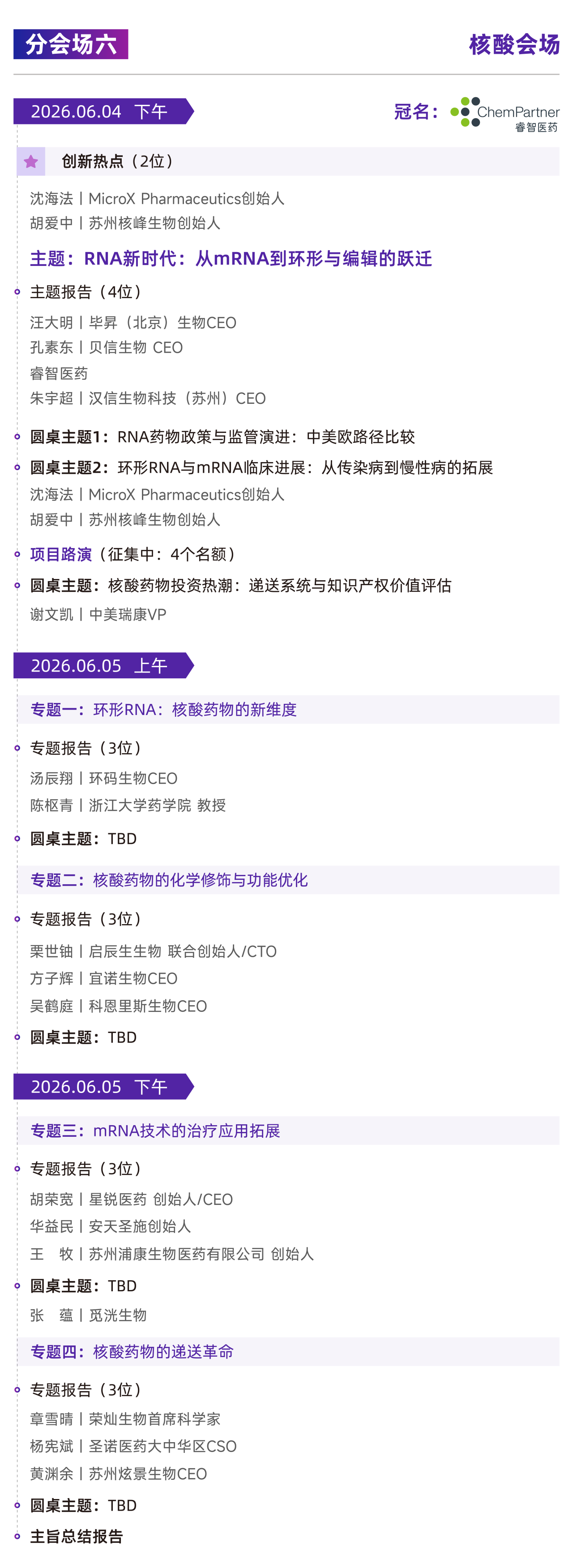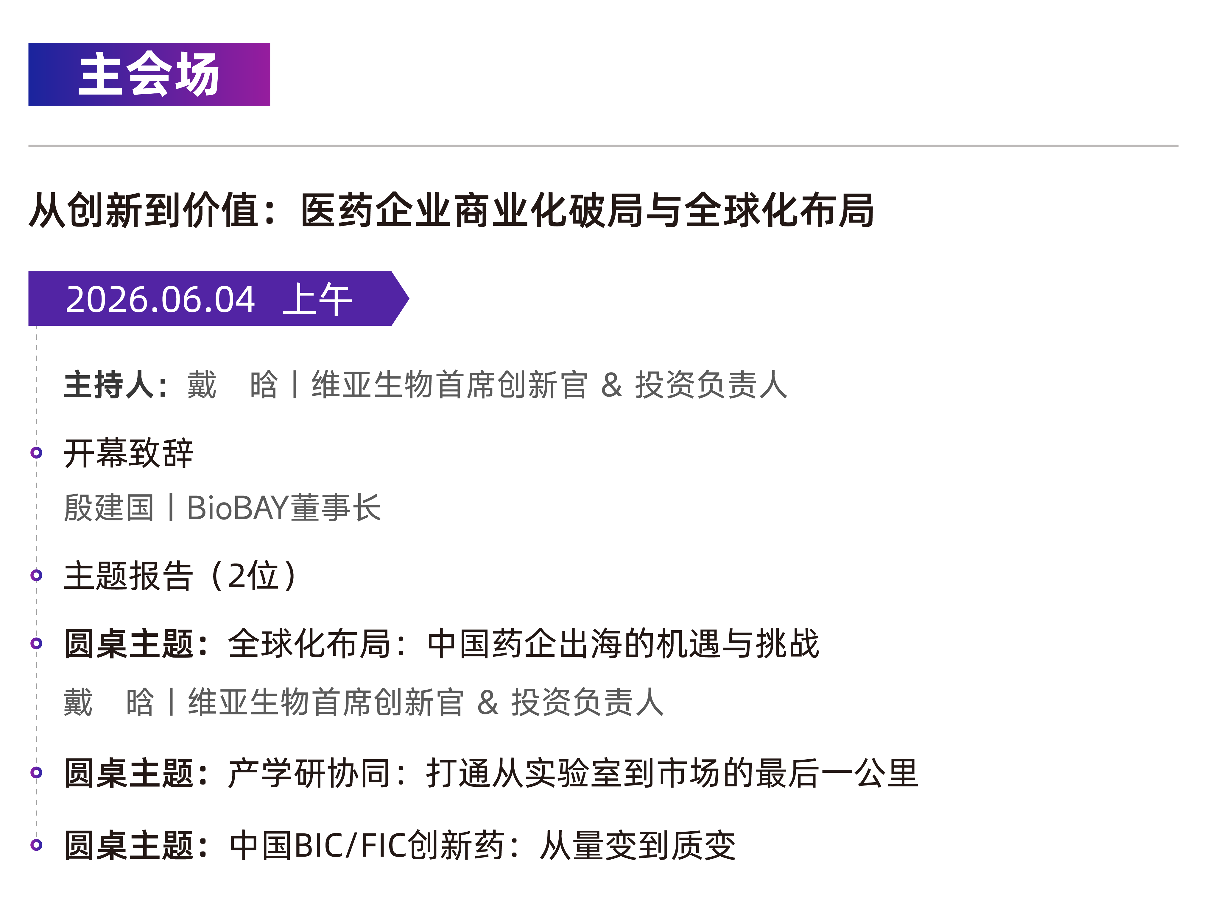 峰会现开放创新项目路演征集,将精选15家最具突破性的生物科技企业。入选企业可获得10分钟路演时段,直面产业领袖与一线投资机构,展示创新技术与商业方案,接受权威专家评审,并有机会现场对接投资意向。高效链接产业资源与资本通道。