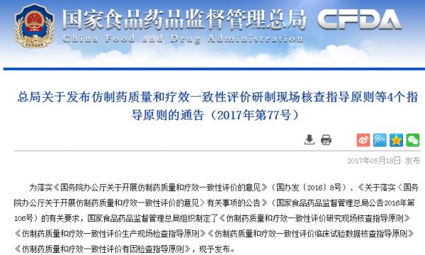昨日(5月18日),CFDA家药监总局发布了仿制药质量和疗效一致性评价4个指导原则的通知。