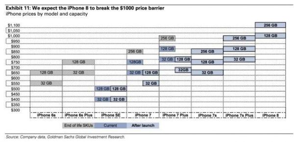 高盛今日发布报告称,苹果公司今年9月将发布三款iPhone手机,其中全新的iPhone 8售价将突破1000美元。