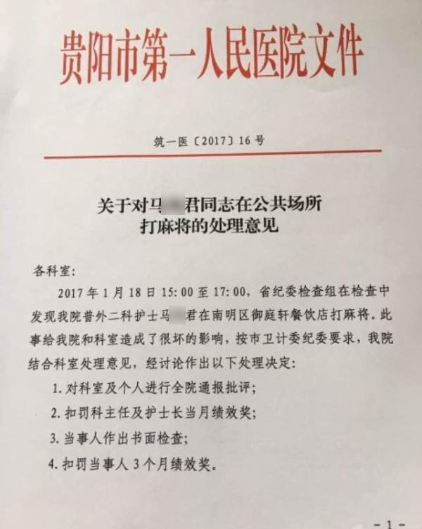 2月10日上午,一份由贵阳市第一人民医院下发的《关于对马某君同志在公共场所打麻将的处理意见》文件在网络热传。