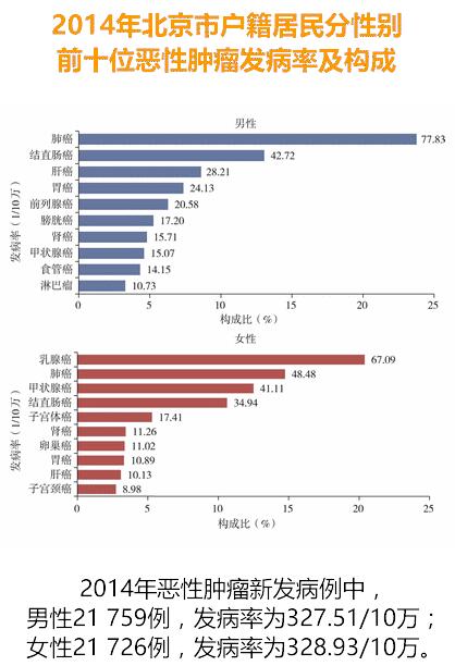 2014年北京市户籍居民共报告恶性肿瘤新发病例43 485例,发病率为328.22/10万,比2013年(315.80/...