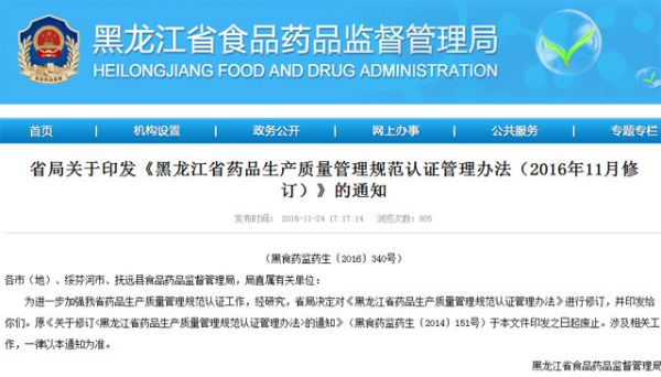 黑龙江省局关于印发《黑龙江省药品生产质量管理规范认证管理办法(2016年11月修订)》的通知