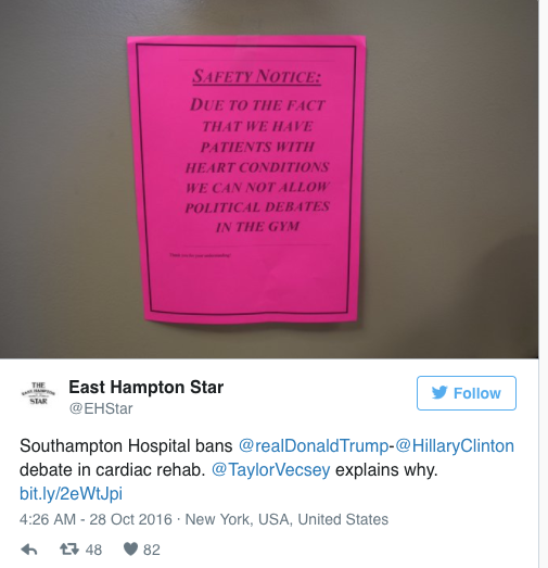 美国总统大选丑闻迭出,观众们表示“小心脏”受不了,纽约长岛南汉普顿医院甚至禁止心脏病患者在其健身中心锻炼时讨论唐纳德。