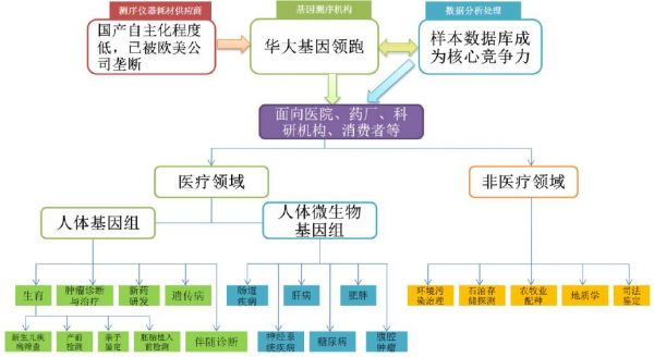 基因测序全产业链划分为上游的测序仪器与试剂耗材市场,中游的基因测序服务市场和下游的生物信息学分析市场。