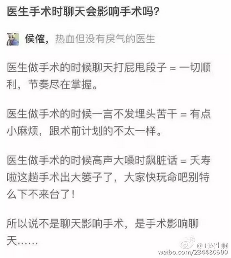 10月25日,丁香园微博转发的一张有关“”医生手术时聊天会影响手术吗?“的图片,引发网友广泛讨论,图片如下:
