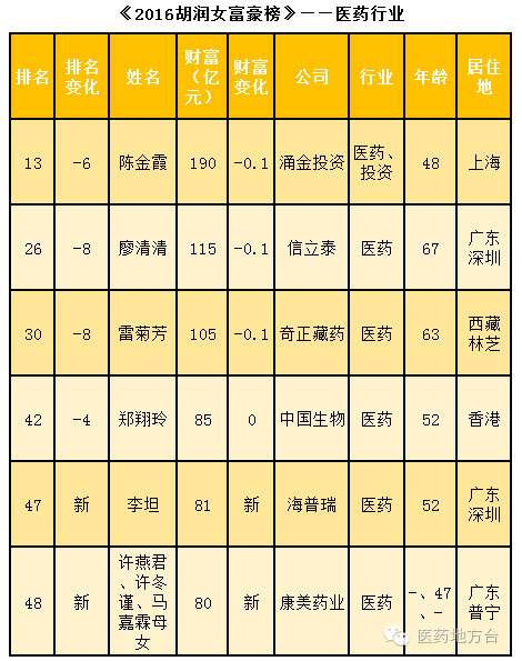 6家药企女富豪上榜《2016年胡润女富豪榜》。