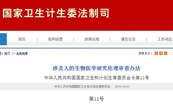 《涉及人的生物医学研究伦理审查办法》已于2016年9月30日经国家卫生计生委委主任会议讨论通过,现予公布,自2016年1...